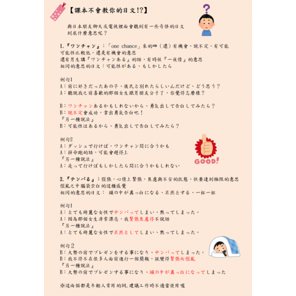 課本不會教你的日文 「ワンチャン」「テンパる」「パクる」「ビビる」究竟是什麼意思呢?課本學的日文跟日文人講的日文不一樣.應該去過日本的人都遇過這個問題.所以日本人的米糕老師教你們實用的日本當地人常用的詞彙.課本不會教你的日文 「ワンチャン」「テンパる」「パクる」「ビビる」究竟是什麼意思呢?